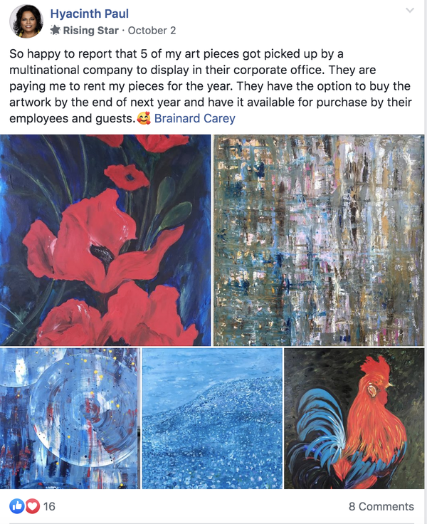 “So happy to report that 5 of my art pieces got picked up by a multinational company to display in their corporate office. They are paying me to rent my pieces for the year. They have the option to buy the artwork by the end of next