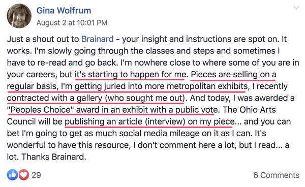 “It’s starting to happen for me. Pieces are selling on a regular basis, I'm getting juried into more metropolitan exhibits, I recently contracted with a gallery (who sought me out). "