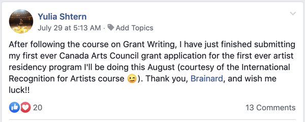 After following the course on Grant Writing, I have just finished submitting my first ever Canada Arts Council grant application for the first ever artist residency program I'll be doing this August (courtesy of the International Recognition for Artists course 😉). Thank you, Brainard, and wish me luck!!