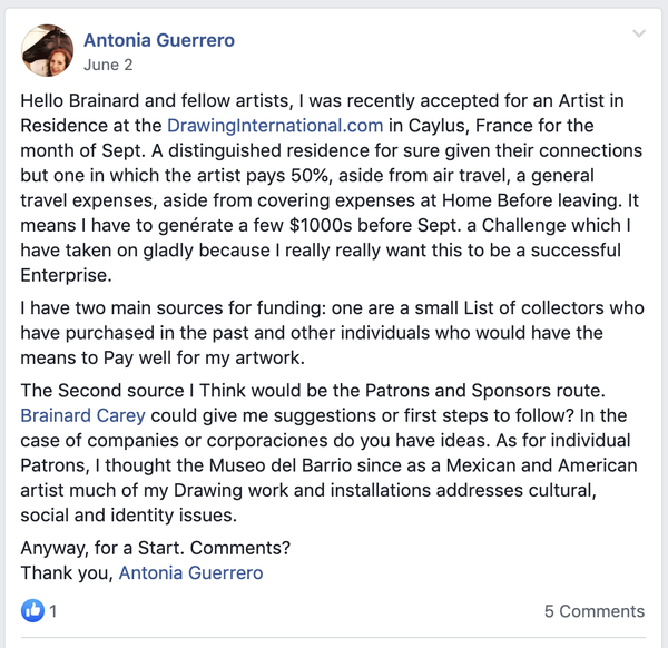 “Hello Brainard and fellow artists, I was recently accepted for an Artist in Residence at the DrawingInternational.com in Caylus, France for the month of Sept. A distinguished residence for sure given their connections but one in which the artist pays 50%, aside from air travel, a general travel expenses, aside from covering expenses at Home Before leaving.