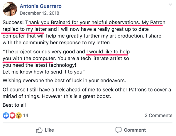 “Brainard - I’m ecstatic to say that I just received $1000 on my very first ask, following your guidance in Patrons & Sponsors For Artists!”