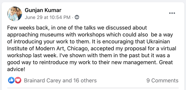 Get a curator to do a Zoom studio visit with you (and prepare for that visit) in 2 months so you feel confident before and after that visit even if your studio is your kitchen table