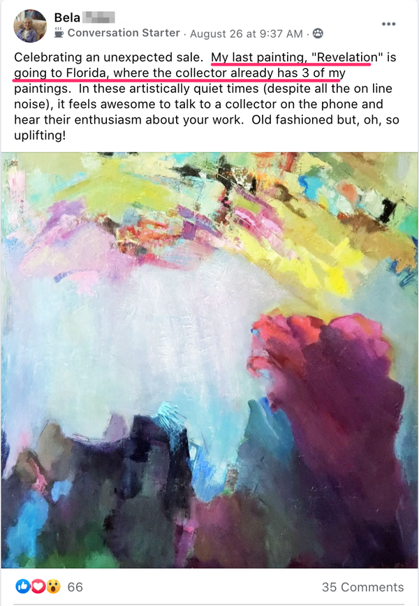 “Celebrating an unexpected sale. My last painting, "Revelation" is going to Florida, where the collector already has 3 of my paintings. In these artistically quiet times (despite all the online noise), it feels awesome to talk to a collector on the phone and hear their enthusiasm about your work. Old fashioned but, oh, so uplifting!”